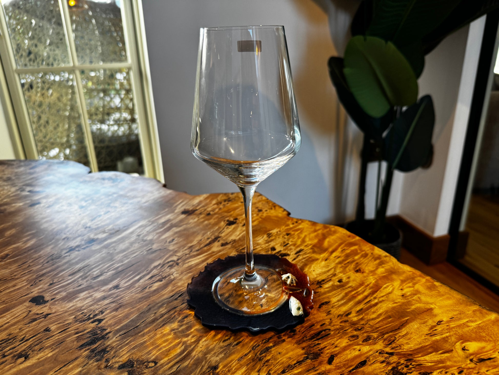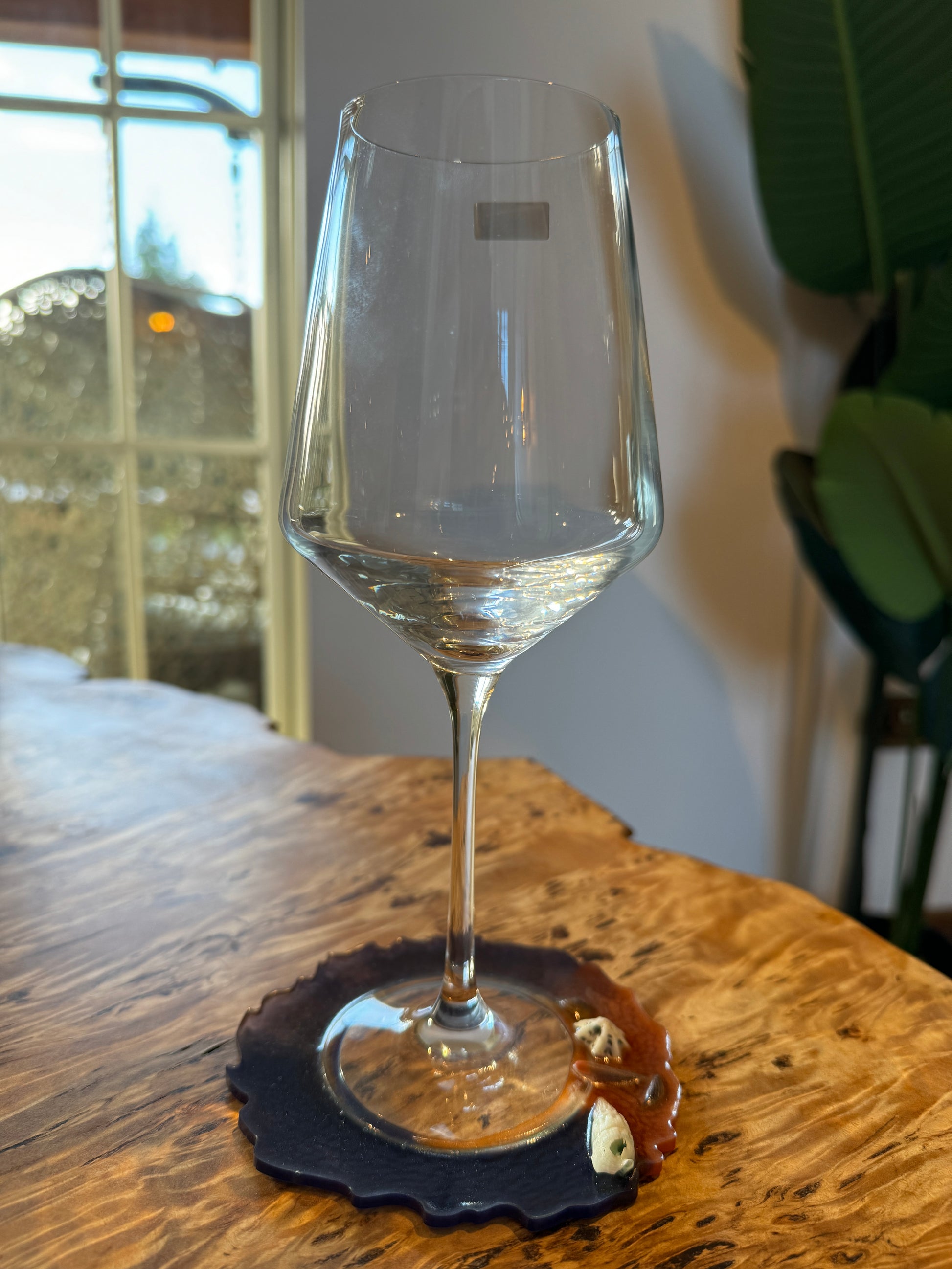 A Little wine glass with a twist. i added some resin with a little beach affect to the bottom , looks really cool.