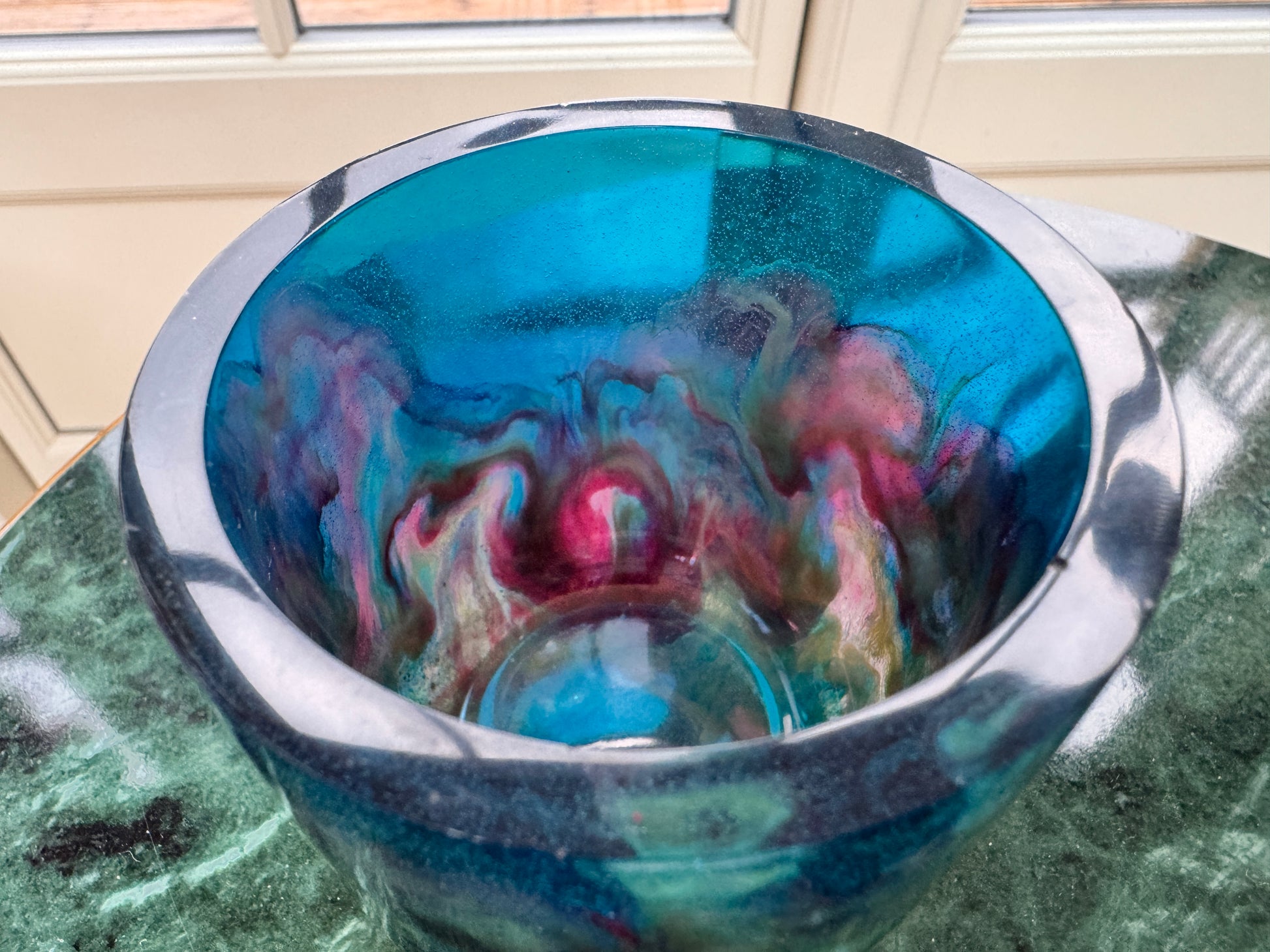 This little pot has some cool colours inside it, mixing in with some reds, greens and yellows to make a cool swirl