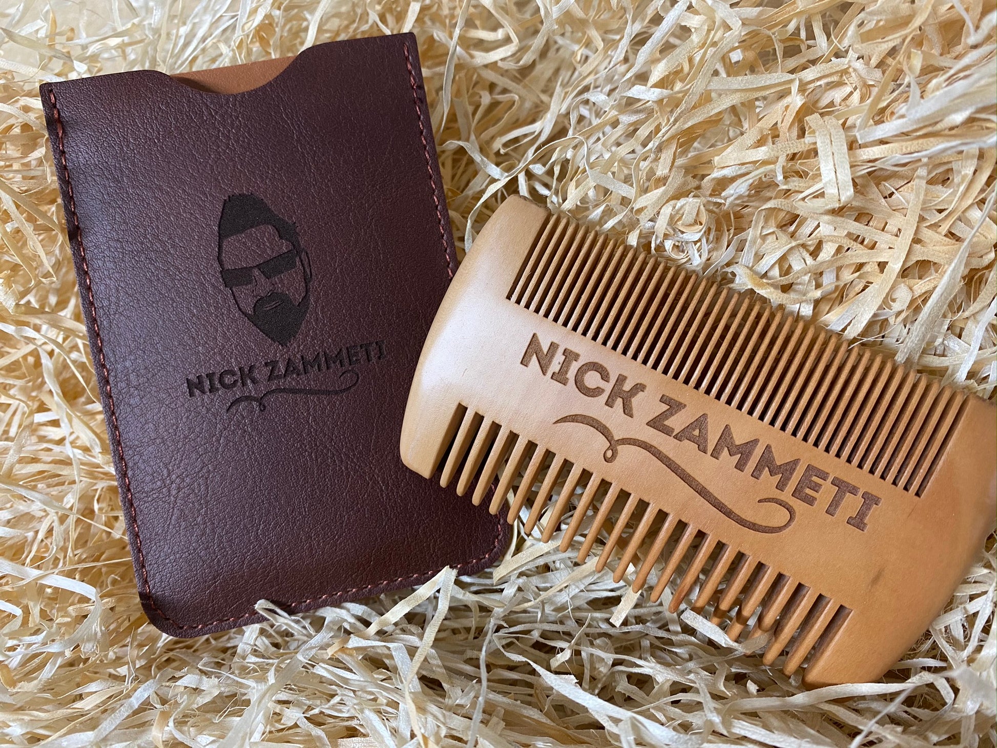 Here is a Nick Zammeti Beard Comb , with branded case made from Beech wood