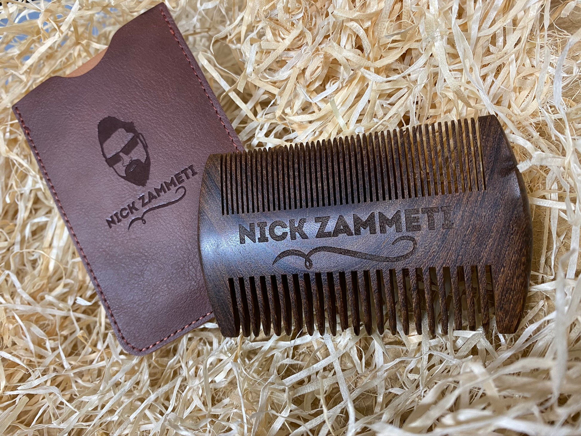 Here is a Nick Zammeti Beard Comb , with branded case made from Sandlewood