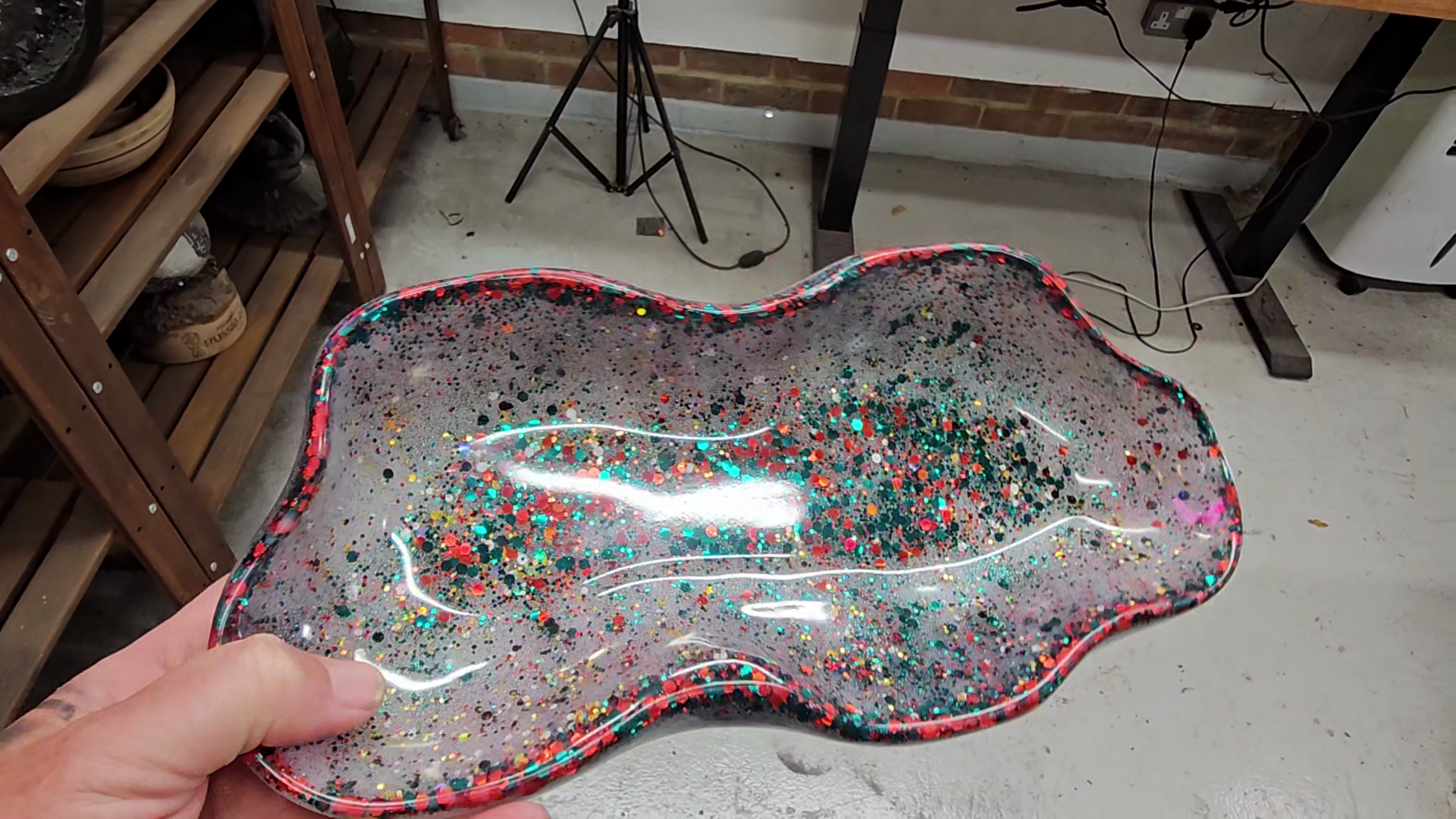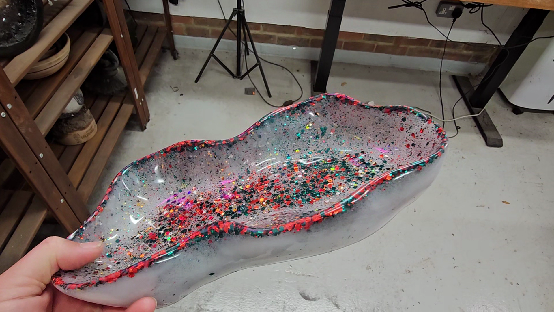 This is a handmade resin tray. It’s crafted from high-quality resin and can be used for a variety of purposes—such as holding keys, jewellery, loose change, or simply as a decorative piece.